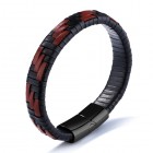 Браслет на руку из натуральной кожи черного цвета с вставками-полосками коричневого цвета. Браслет имеет упругий каркас и поэтому будет держать форму на руке. Замок выполнен из нержавеющей стали и покрыт стойким черным лаком. Внутри замка находится магнит, фиксирующий браслет от самопроизвольного расстегивания.