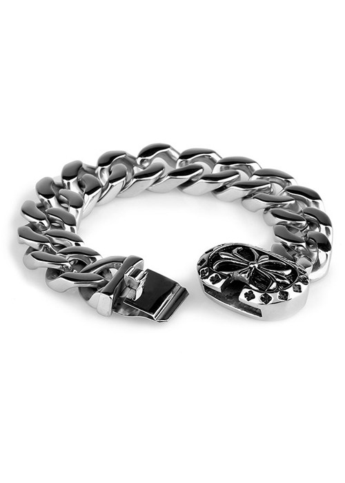 Крупный браслет на руку в виде грубой цепи из стали 316L с стильным замком-набалдашником, декорированного крестом. Размеры коробчатого замка(овала): 39 мм х 26 мм. Брутальный внешний вид. Браслет на фото немного затемнен (блики), в живую цвет - серебристый или цвет стали.