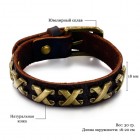 Мужской браслет из кожи с классическим ременным замком. По периметру - шесть икс-образных пластин. Мягкая натуральная кожа будет приятно прилегать к телу, а ювелирный сплав металлических пластин не сотрется и не вызовет аллергии на коже. Этот браслет на запястье от 15,5 до 19,5 см.