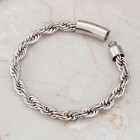 Стильный стальной браслет в виде каната диаметром 8 мм и коробчатым замком диаметром 10 мм. В застегнутом состоянии браслет без покрытия имеет длину окружности 19 см, то есть хорошо сядет на запястье 17-18,5 см, а черненый - чуть больше и имеет длину окружности 20,5 см. Замок расстегивается нажатием на клавишу. Качественная сталь не потемнеет со временем и не вызовет аллергию на коже. Выберите свой браслет "Rope" - в классическом стальном исполнении или с поверхностной обработкой металла в виде чернения.