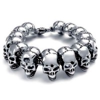 Стальной браслет в виде последовательно соединенных черепов. Выберите браслет с шестью или семью черепами, в зависимости от желаемой длины браслета. Изящный замок-проушина не даст самопроизвольно браслету расстегнуться.