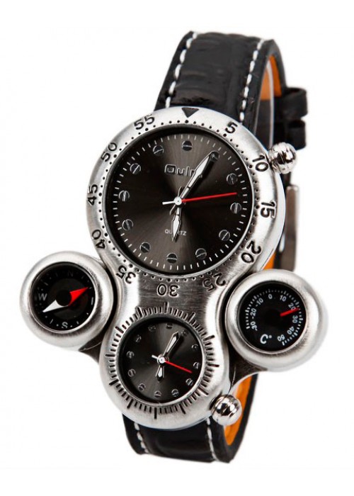 Неформальная модель часов понравится коллекционерам модных идей. Циферблаты находятся не в одном корпусе, как это можно наблюдать у классических образцов, а вынесены отдельно, и расположены в полной изоляции друг от друга. Это обуславливает совершенно новый взгляд на форму корпуса, который отличается от общепринятого, поэтому такие кварцевые мужские наручные часы анонсированы как настоящий статусный аксессуар. Чтобы уравновесить столь необычный дизайн корпуса была выбрана нейтральная из вполне ожидаемых расцветок: стального цвета корпус и выдержанные в серебристо-чёрной гамме циферблаты, которые эффектно оттеняются чёрным ремешком.