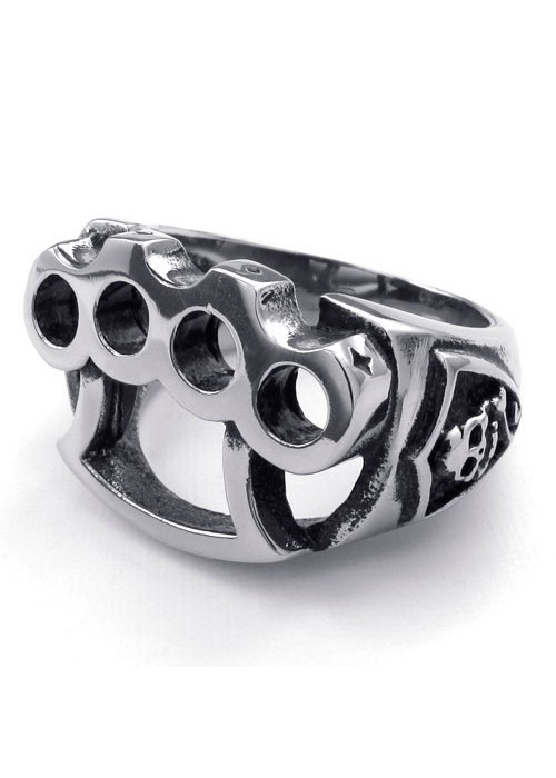 Мужское кольцо в виде кастета. Стильное тематическое решение из качественного материала. Углубления заполнены стойким черным цветом.